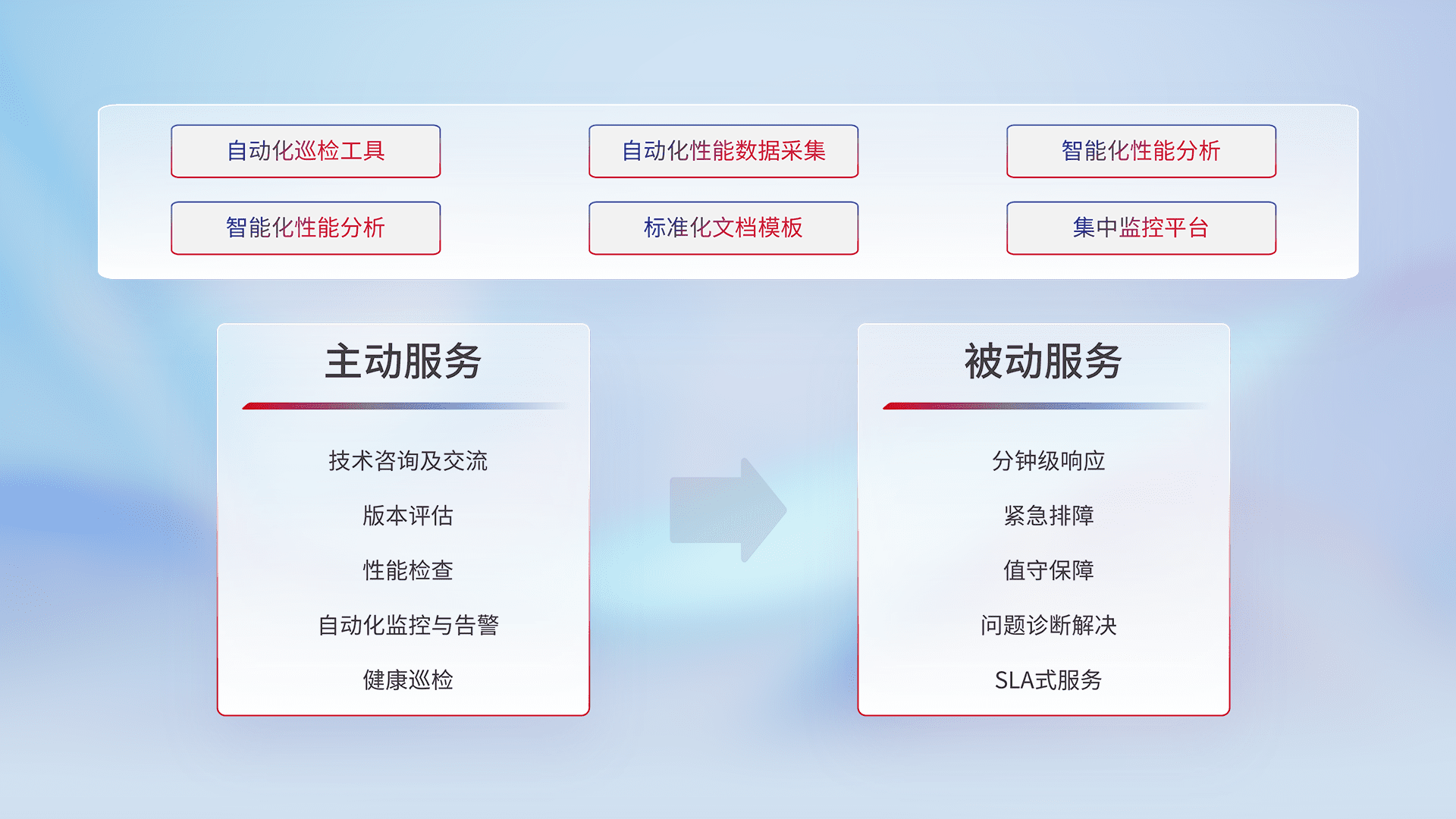 智能化工具和标准化文档,,,保障服务质量,,,提供主动服务(包含技术咨询、、版本评估、、、性能检查、、、、自动化监控与告警、、、、健康巡检)和被动服务包含(分钟级响应、、紧急排障、、、值守保障、、、问题诊断解决、、SLA服务)。。